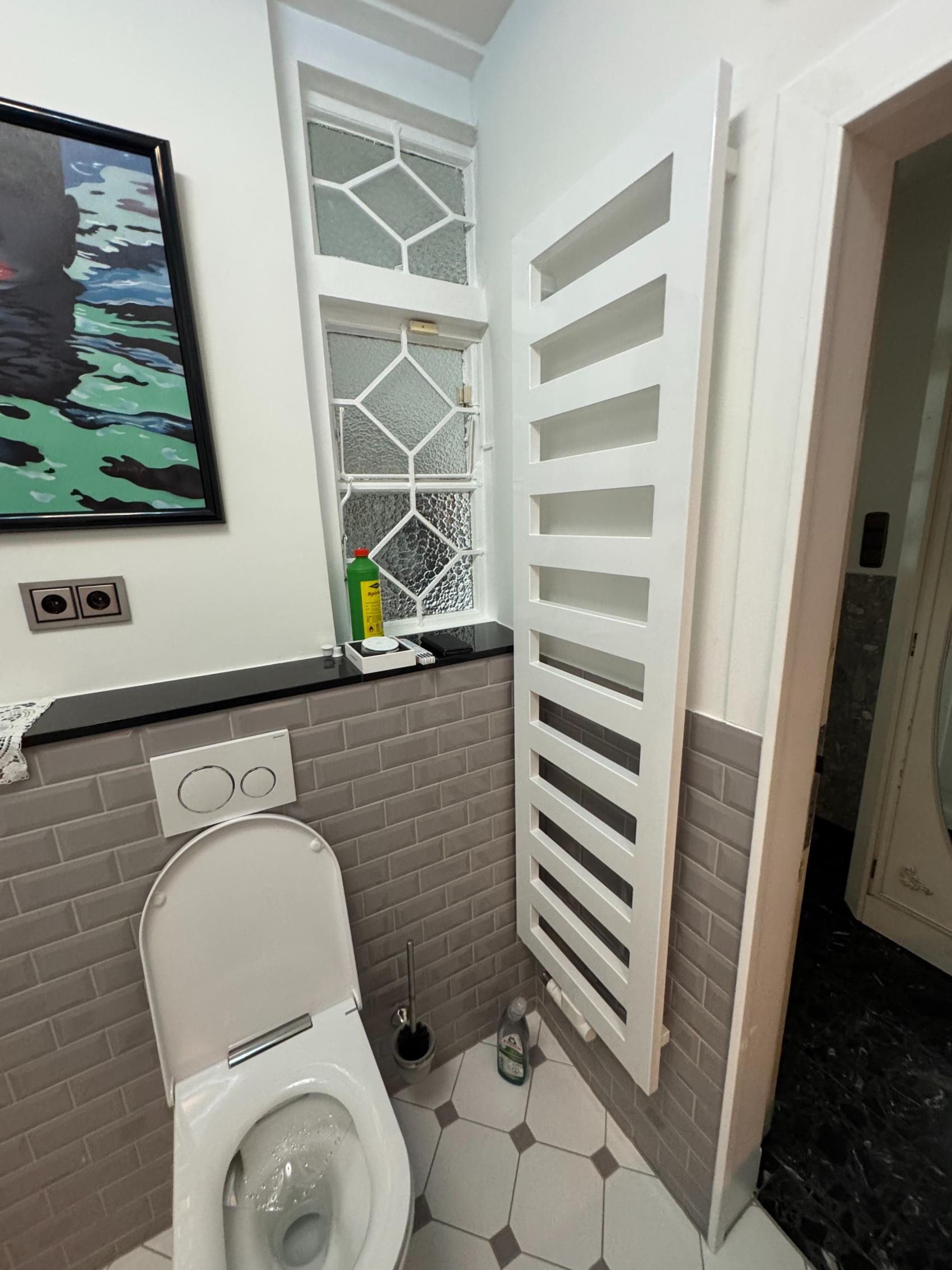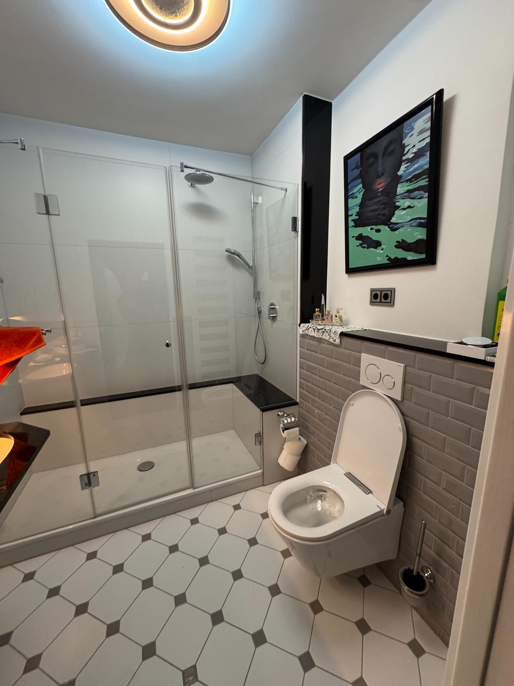Ein besonderes Highlight ist das neue Dusch-WC, das höchsten Hygienestandard und zusätzlichen Komfort vereint. Zum Einsatz kamen ausschließlich Markenprodukte von Grohe, Axent, Geberit und Bette – für ein langlebiges, stilvolles Ergebnis, das den Charakter des Altbaus modern interpretiert.